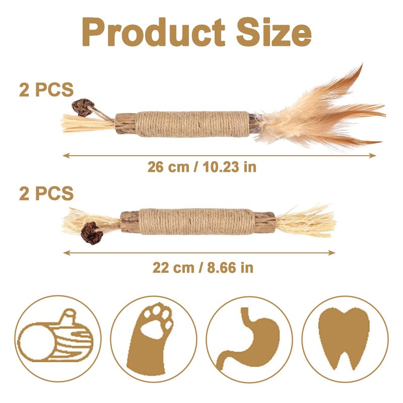 • 【Interactive Cat Toy】 You will receive 2 pieces feather cat nip toys and 2 pieces long cat sticks, the silvervine for cats is suitable for small to medium cats to chew and play. And the size of the feather cat chews nip toys is 26*1.3*1.3cm/10.23*0.51*0.51in. The size of the long kitten chew toys is 22*1.3*1.3cm/8.66*0.51*0.51in