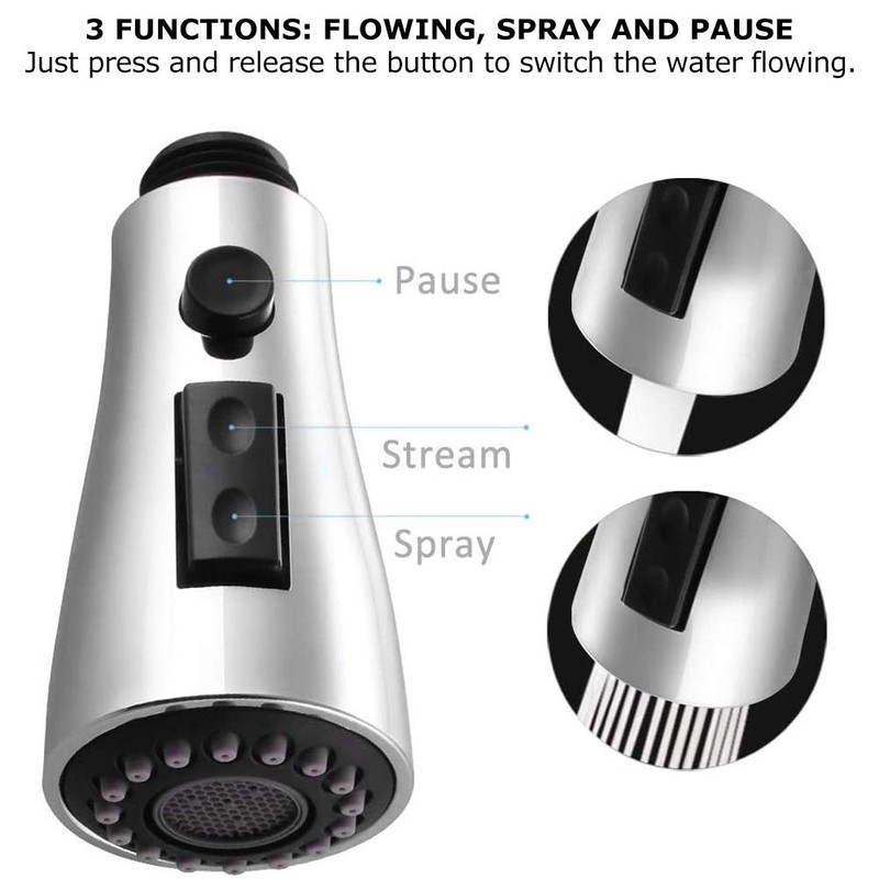 - With 3 functions: The faucet sprayer has three functions: flowing, spray and pause. Just press and release the button to switch the water flowing.
