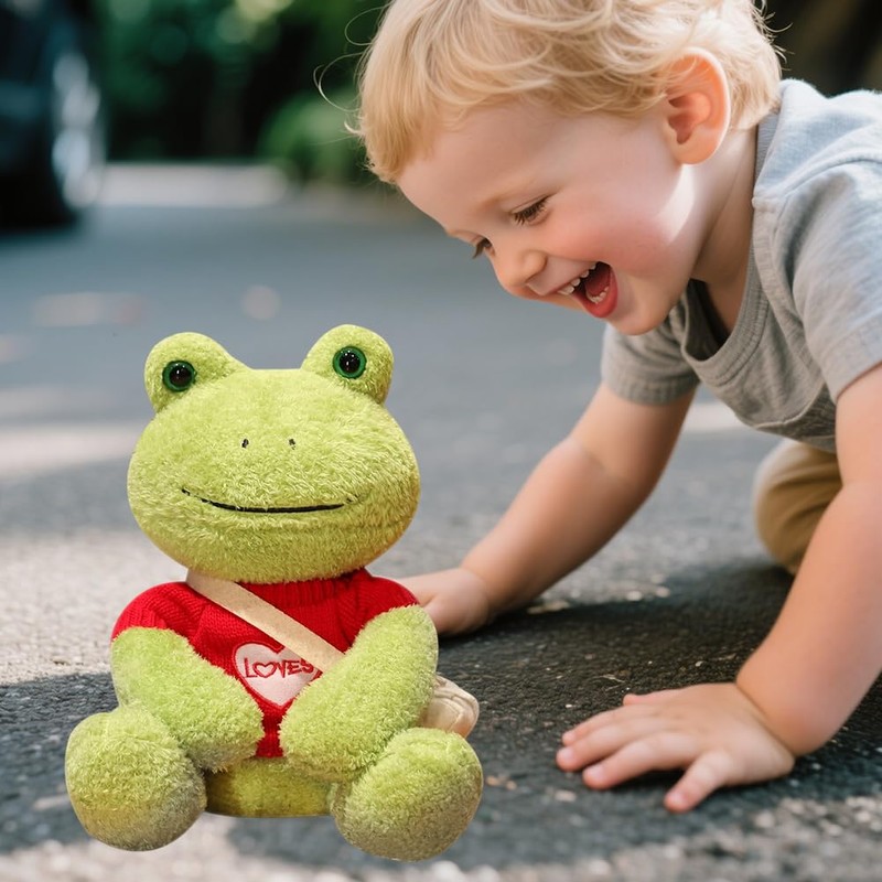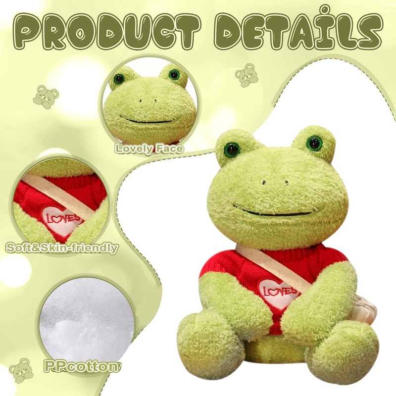 - 【Adorably Dressed Frog Plush with Valentine's Charm】 This irresistibly cute plush frog wears a cozy red knit sweater embroidered with "LOVE" lettering and carries a tiny white purse accessory, creating the perfect stuffed animal that's full of charm and personality.