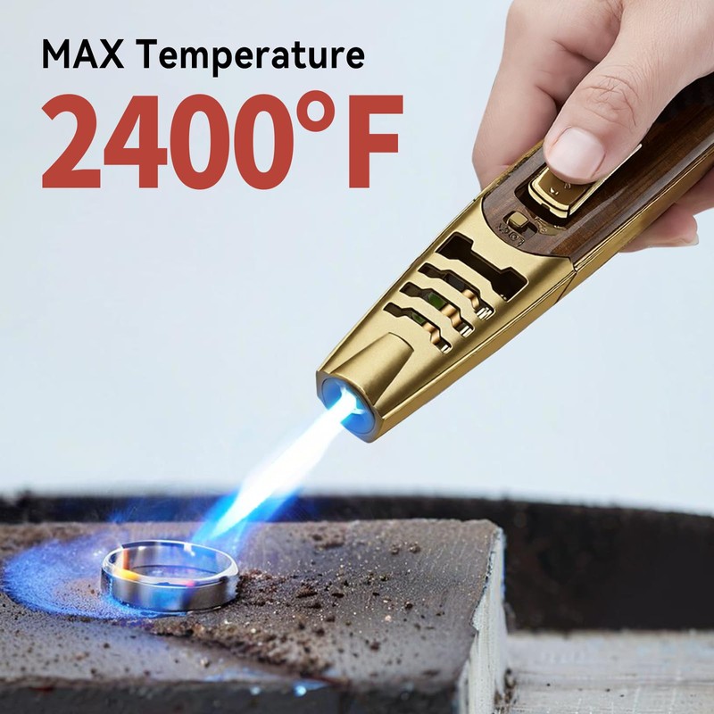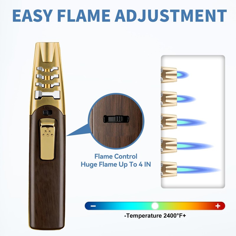 - [Powerful Flame]: ZQMW butane torch lighter has a large quality copper nozzle that produces a strong jet flame, reaching a maximum temperature of 2400°F. Its windproof design ensures reliable performance even in harsh conditions, making it perfect for use in rain and snow!