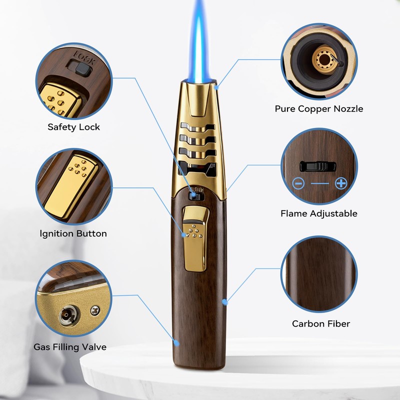 - [Durable and Safe]: Tested for 10,000+ ignitions in the lab, its high quality copper nozzle ensures durability and steady flame support, while the cooling holes and ceramic port provide maximum heat dissipation, preventing damage from high temperatures. With its dual safe lock and ergonomic design, this portable torch lighter keeps you away from the flame and potential accidents.