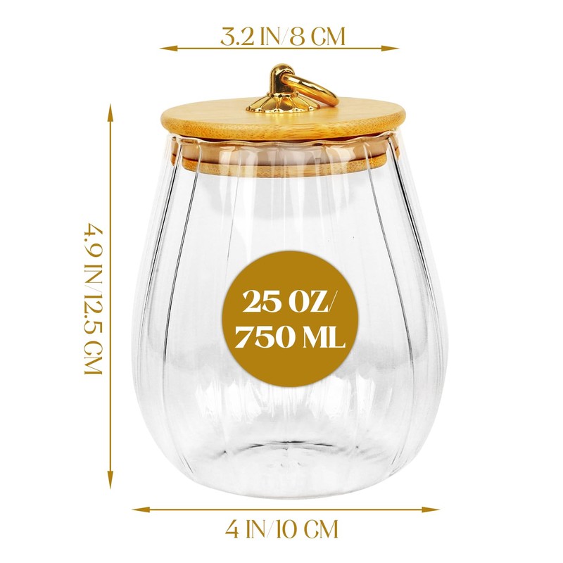 - Package Includes: 4 pieces of petal glass canisters with airtight lids glass jars with bamboo lids glass canisters with bamboo lids and metal handles. Dimensions: 4.5"D x 4.7"H; Opening for Jar: 3.3"; Capacity: 25 oz; Weight: 232g. This candy jar cookie jars is a highly valued set, providing sufficient quantity to meet your daily needs