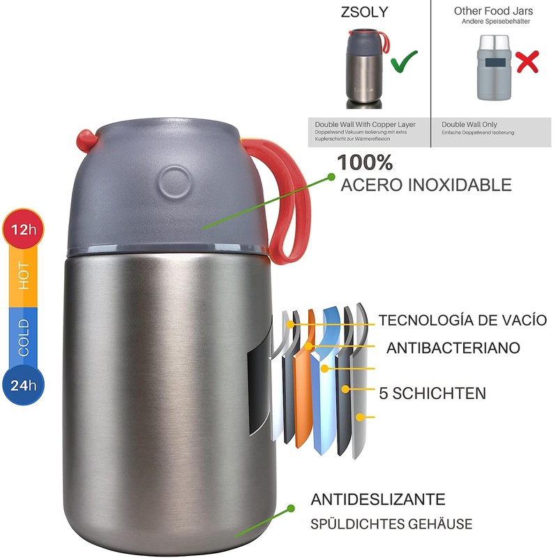 - ZSOLY Termo para Comida Caliente: DisenO Unico de Doble Capa Al Vacio para Mantener La Temperatura Y La Frescura De Los Alimentos. Capacidad de 650 Mililitros, Ideal para La Escuela, El Almuerzo y Sopas. Fabricado en Acero Inoxidable, Resistente y Confiable. Elige ZSOLY Termo para Comida Caliente NiñOs y Brinda A Tus Hijos Comodidad, Salud y Sabores Deliciosos.