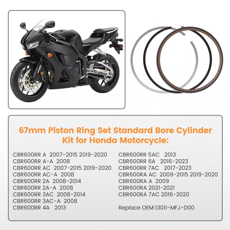- Vehicle CompatibilityMotorcycle Piston Ring Kit for Honda CBR600RR A 2007-2015 2019-2020;CBR600RR A-A 2008;CBR600RR AC 2007-2015 2019-2020;CBR600RR AC-A 2008;CBR600RR 2A 2008-2014;CBR600RR 2A-A 2008;CBR600RR 3AC 2008-2014;CBR600RR 3AC-A 2008;CBR600RR 4A 2013;CBR600RR 5AC 2013;CBR600RR 6A 2016-2023;CBR600RR 7AC 2017-2023;CBR600RA AC 2009-2015 2019-2020;CBR600RA A 2009;CBR600RA 2021-2021;CBR600RA 7AC 2016-2020.