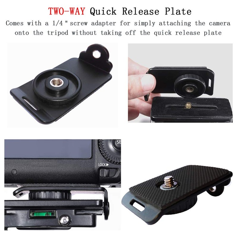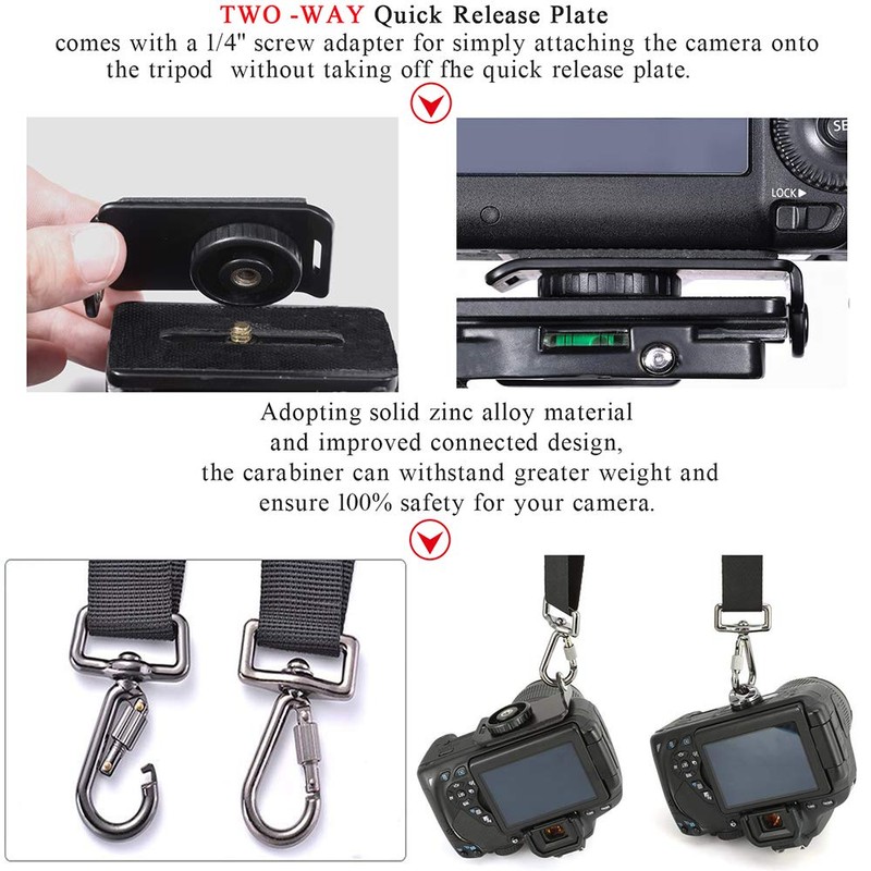 * Comes with 2 multipurpose metal quick release plates that securely connect your camera and strap. Equipped with 2 standard 1/4 screws, 2 safety ropes to ensure the safety of the camera.