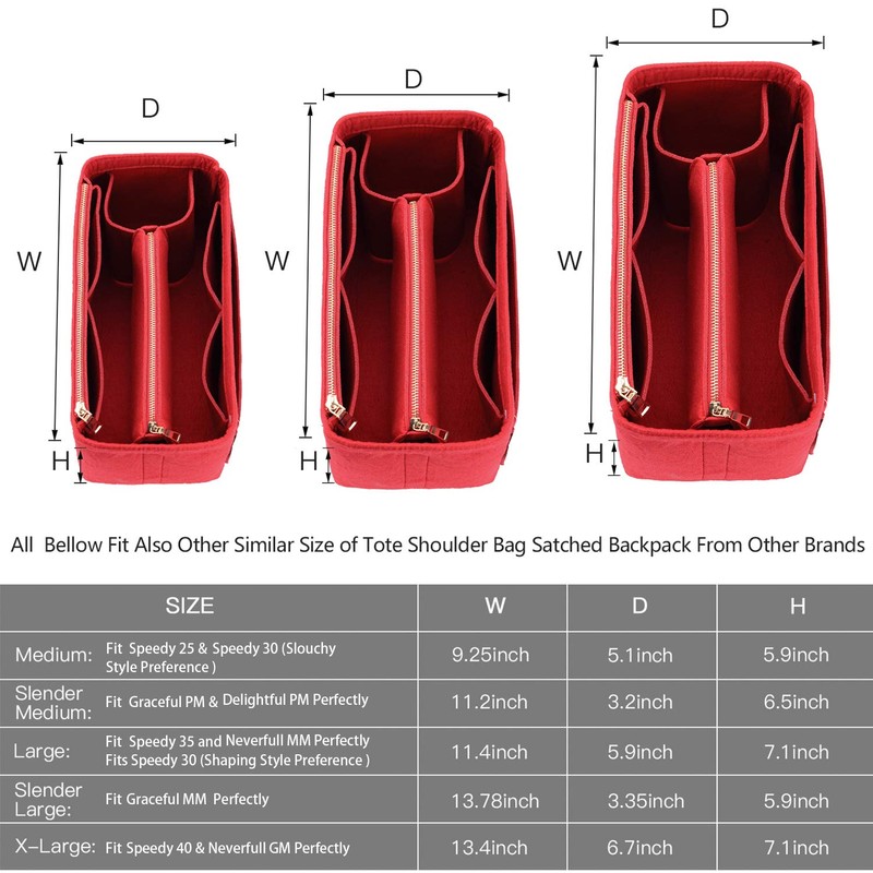 - Dimension Of Purse Organizer: Medium: 9.25(W)*5.9(H)*5.1(D) inches Fits Speedy 25 and Speedy 30 (Slouchy Style Preference).Slender Medium: 11.2(W)*6.5(H)*3.2(D)inch Fits Graceful PM and Delightful PM. Large:11.4(W)*7.1(H)*5.9(D)inches Fits Speedy 35 and Neverfull MM Perfectly Fit Speedy 30(Shaping Style Preference). Slender Large:13.78(W)*5.9(H)*3.35(D) Fit Graceful MM Perfectly. X-Large:13.4(W)*7.1(H) *6.7(D) fits Speedy 40 and Neverfull GM Perfectly.