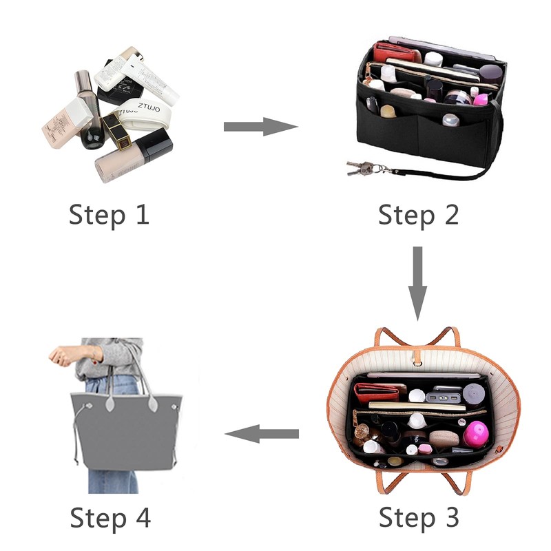 ZTUJO Purse Organizer Insert, Felt Bag Organizer with Metal Zipper, Handbag & Tote Shaper, For Speedy Neverfull Tote, 7 Sizes, Black, Small