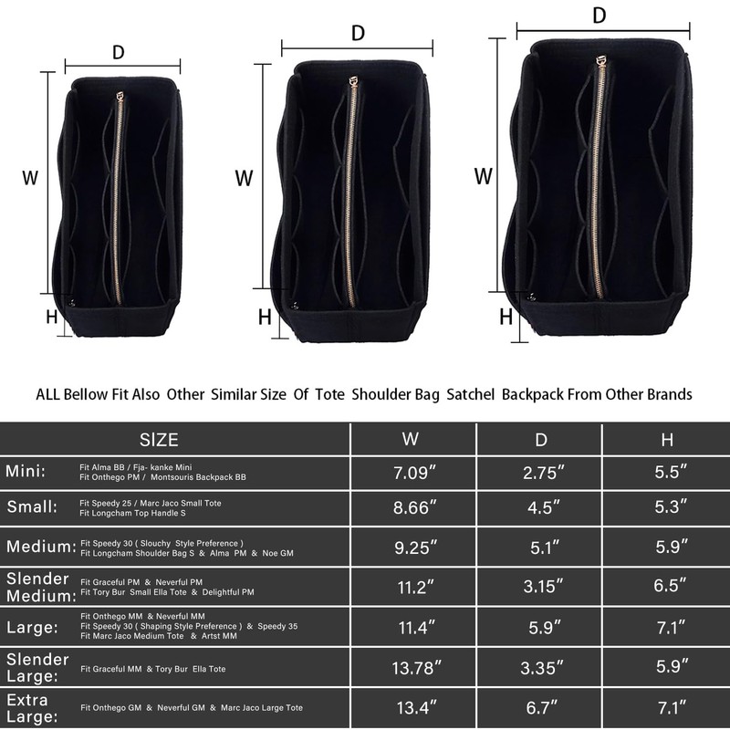 - 💗SIZE OF BAG ORGANIZER: Mini Purse Organizer: 7.09(W)*5.5(H)*2.75(D) inch Fits Alam BB and Fja-Kanke Mini ;onthego Pm and Montsouris BB. Small Purse Organizer: 8.66(W)*5.3(H)*4.5(D) inch Fits MJ Small Tote, Speedy 25, LC op Handle S and Book Tote New Small. Medium Purse Organizer:9.25(W)*5.9(H)*5.1(D)inch Fits 30 (Slouchy Style Preference). Slender Medium Purse Organizer: 11.2(W)*6.5(H)*3.2(D)inch Fits Graceful PM and Delightful PM
