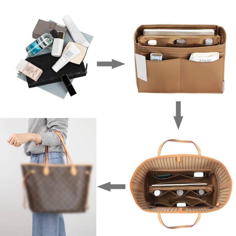 ZTUJO Purse Organizer Insert, Felt Bag Organizer with Metal Zipper, Handbag & Tote Shaper, For Speedy Neverfull Tote, 7 Sizes(Small, Silky Brown)