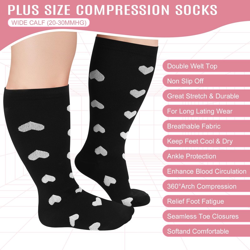 - 【20-30 mmHg Plus Size Compression Socks】You will receive 3 pairs of compression socks (20-30 mmHg) in solid black, black with white polka dots, and black with white hearts. Available in a variety of sizes from XXL to 4XL to ensure a comfortable fit for wide calves