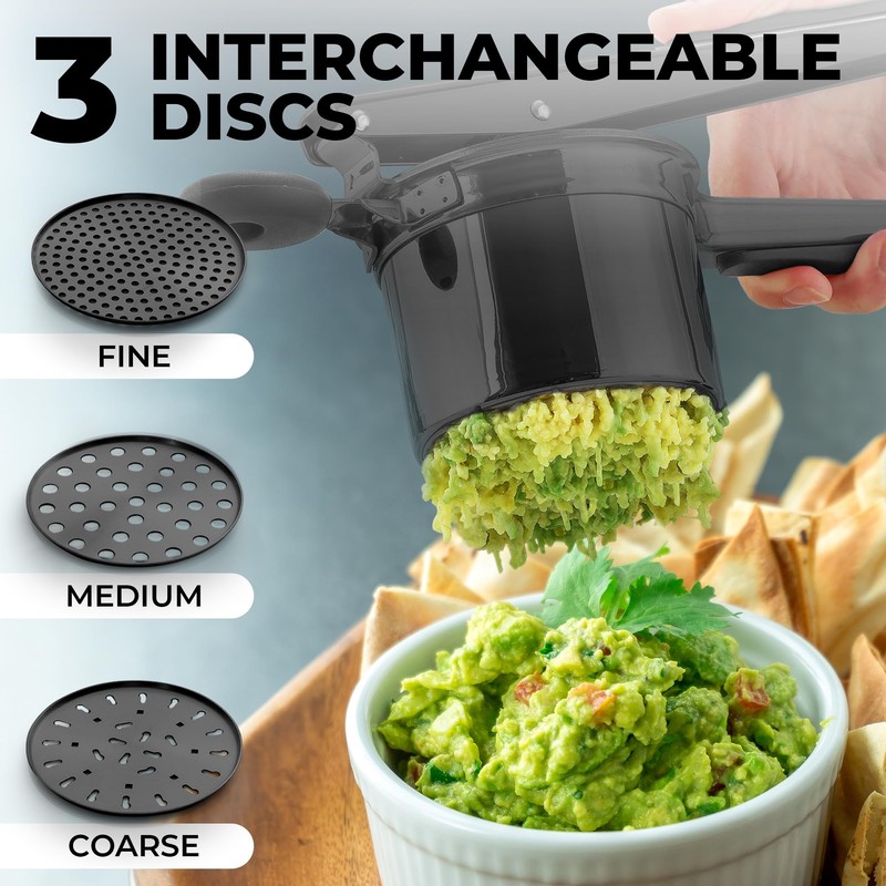 - 3 INTERCHANGEABLE DISCS: This potato masher comes with 3 versatile discs for fine, medium, and coarse mash. With the 13.5 oz deep basket, you can use this to mash large quantities of potatoes, enough for the whole family. Use it to mash avocados, squash, cauliflower, plantain, or baby food. It is also great for making gnocchi, spaetzle, and even spaghetti ice cream.