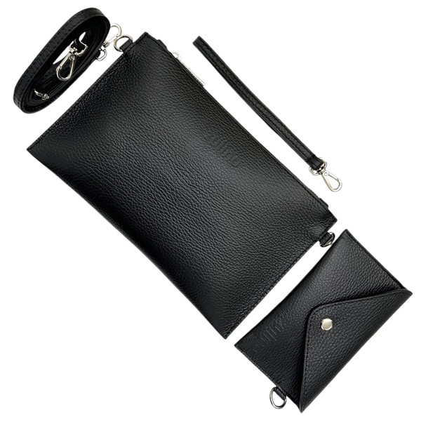 Zulino Shoulder Bag Handbag Set Genuine Leather Clutch Passport Bag Double Strap Removable Adjustable Leather Edges Sealed 25 x 15 cm, black
