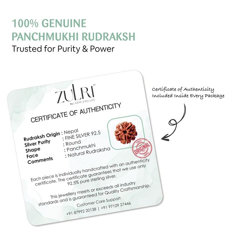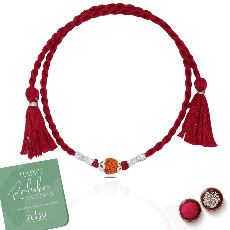ZULRI 92.5 Sterling Silver Panchmukhi Rudraksha Red Thread Rakhi For Rakshabandhan, Rakhi With Fragrance Greeting Card & Roli Chawal and Silver Certificate of Authenticity
