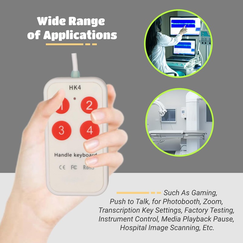Applications: designed for free two-handed environments such as games, push-to-talk, for photobooth, zoom, transcription key settings, factory testing, instrument control, media playback pause, scanning hospital pictures, etc.