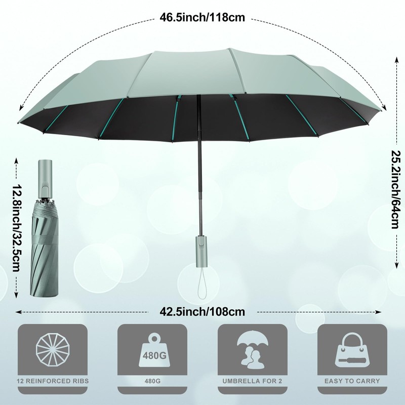 Durable Construction: Our 12-rib umbrella is built to withstand strong winds and last for a long time. The sturdy construction ensures it won't easily break or bend, providing reliable protection during unexpected weather conditions. Compact and Portable: The folding design makes it easy to carry and store. It folds down to a compact size, perfect for travelers and people on the go. Whether you're on a trip, commuting, or just out and about, this umbrella won't take up much space in your bag or luggage. Reliable Rain Protection: With its generous canopy size, this umbrella offers excellent coverage to shield you from rain showers. The waterproof fabric repels water effectively, keeping you dry and comfortable. It's a reliable companion for your outdoor adventures or daily commutes. Versatile for Any Occasion: This umbrella is designed for various situations. It works equally well as a travel umbrella, golf umbrella, or everyday accessory. Whether you're strolling through the city streets or hitting the golf course, this umbrella is versatile enough to meet your needs. Easy to Use: The automatic open and close feature adds convenience to your life. With just a press of a button, the umbrella quickly opens or folds up, saving you time and effort. The ergonomic handle provides a comfortable grip, ensuring a smooth and hassle-free experience.