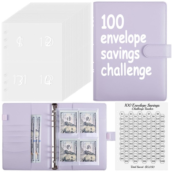 Zuozee 100 Envelopes Money Saving Challenge Binder, A5 Savings Binder with Cash Envelopes, Budget Binder for Planning and Saving $5050, Light Purple