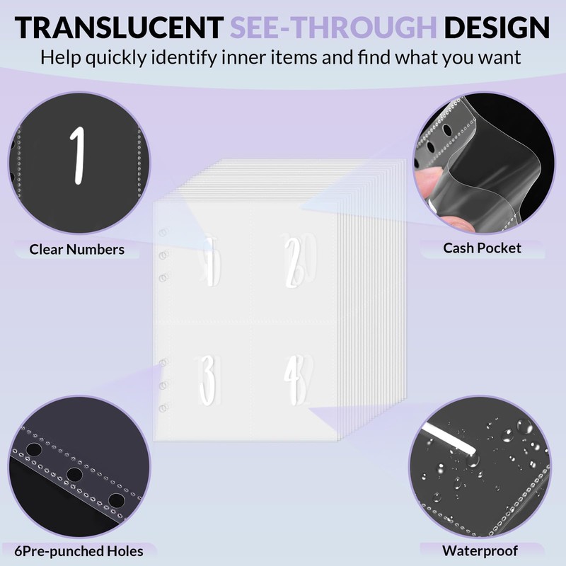 - Affordable Budget Kit: An A5 binder shell with card slot, cash wallet and stainless steel ring, 25 reusable transparent cash envelopes (number 1 to 100), a digital sticker 1 to 100 for marking, and secure button for property protection. A wealth of available accessories, good budget organizer!