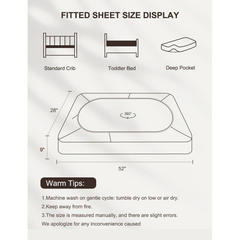 - Crib Sheets size: 52"x28"x9"(133cmx71cmx22cm).