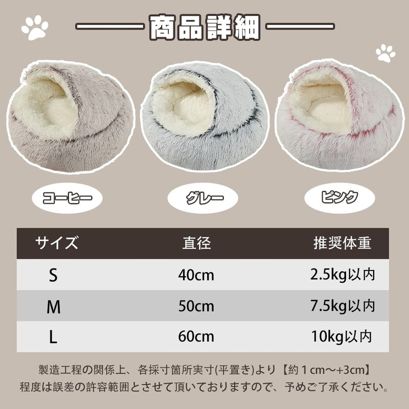 - 5. Size: S: Diameter 15.7 inches (40 cm), M: Diameter 19.7 inches (50 cm), L: Diameter 23.6 inches (60 cm), 3 sizes available. Small size is suitable for kittens and puppies within 5.5 lbs (2.5 kg). Size M fits cats and small dogs within 16.5 lbs (7.5 kg). L size is suitable for cats and dogs within 22.0 lbs (10 kg). The color may appear slightly different from the actual product due to the shooting environment or your computer display. Due to the nature of the manufacturing process, there may be a margin of error between approx. 0.4 - +1.2 inches (1 - +3 cm) from the actual dimensions of each measuring area (laid flat)