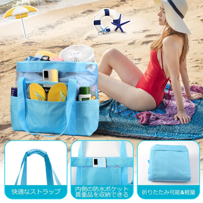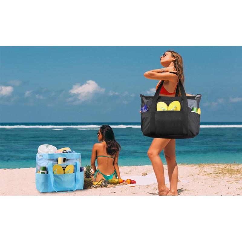 - 【SUPER LARGE CAPACITY】The ultimate beach pal 38L mesh beach bag is well designed and roomy enough to easily store all your daily beach essentials. The bag has 6 extra large water and sand resistant exterior pockets for quick access to all items. Plus, the sand-resistant bottom and splash-proof interior zippered pocket keep your valuables safe. Not only is it practical, it is also stylish and durable. Complete your beach day with this beach bag