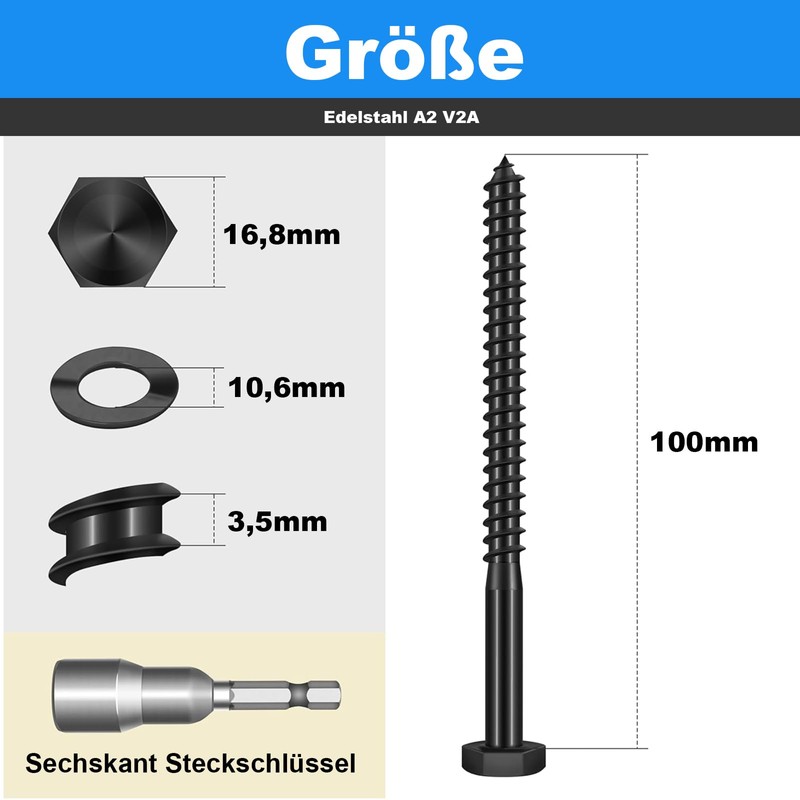 Zuyya Pack of 8 Wood Screws Hex M10 x 100 mm, Black Key Screws Stainless Steel A2 V2A with Washers and Socket Wrench