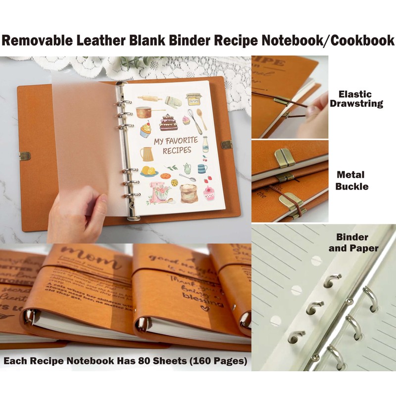 - Materials: Made of faux leather, and elastic rope,inner paper block,stainless steel binder, Easy to open and change the inner paper block, you can easily rearrange your recipes, add new ones, or remove outdated ones