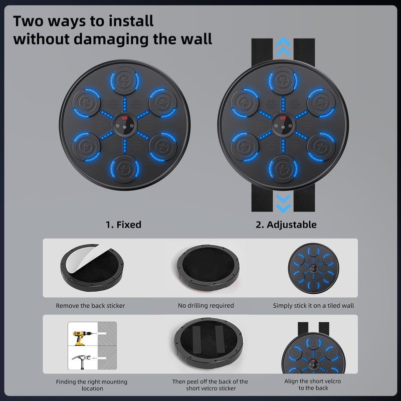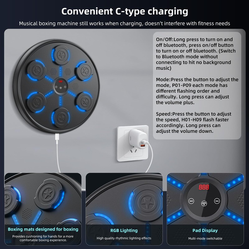 - 【RGB Cool Lights & LED Display & Bluetooth】This smart music boxing machine is equipped with upgraded speakers. When you hit the lit target, the device will emit music and light effects, and the LED display will show your hit count to stimulate your interest in exercise. The smart boxing music machine supports Bluetooth pairing, and you can choose your favorite songs during boxing training. Surround speakers and cool lights bring you the best audio-visual effects and the best exercise experience.