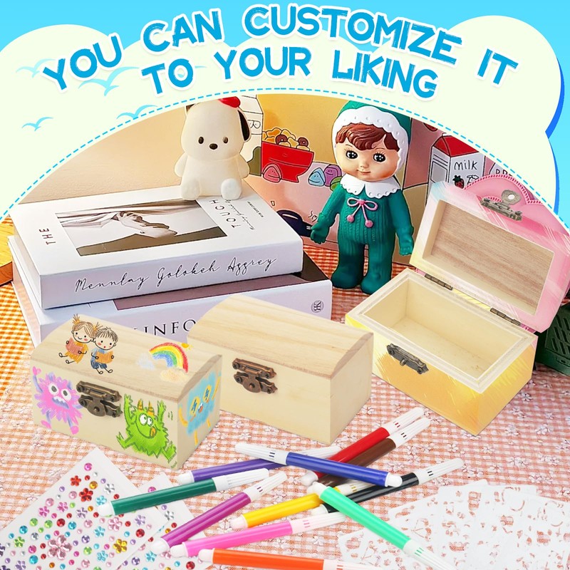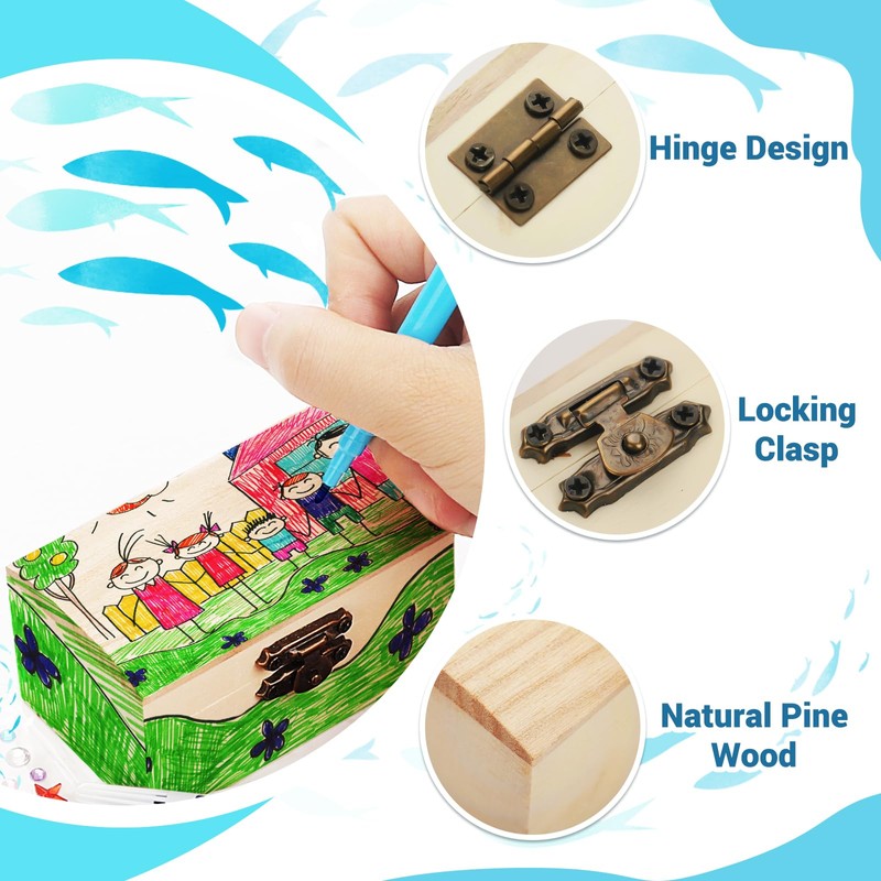 - Quality Pinewood: Crafted from high-quality pinewood with a smooth unfinished surface, these wooden boxes with hinged lids provide a sturdy foundation for your creativity. These craft projects can be sanded, painted, and adorned with embellishments using glue.