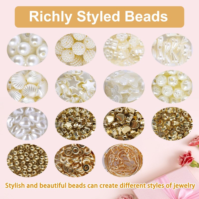 ZWQLZG Pearl Beads Bracelet Making Kit, 1120 Pcs White Beads and Gold Beads for Bracelet Making, DIY Bead Bracelet Making Kit with 5 Different Sizes of Plastic Pearl Beads