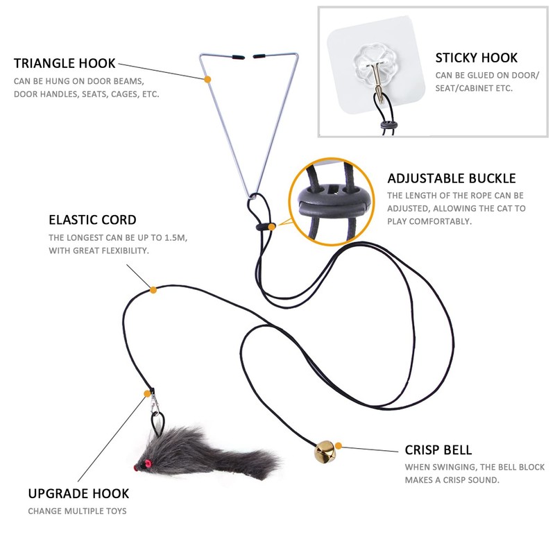 • Triangle Hook: You can hang this triangular hook cat toy on door frames, cat climbing frames, chairs, tables, etc., with a stable triangular clamping force design with non-slip rubber ends.