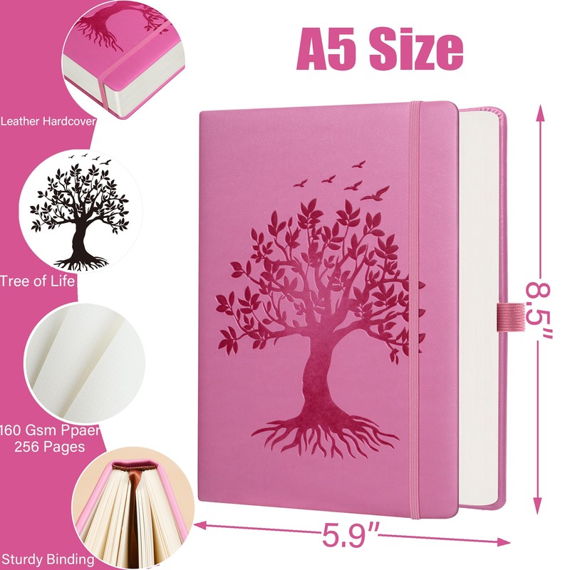 ZXHQ A5 Bullet Dotted Journal Notebook for Women -150gsm Thick Paper, 256 Pages, Dot Grid Hardcover, Tree of Life Design, Fine Inner Pocket - 5.9" × 8.5" Pink