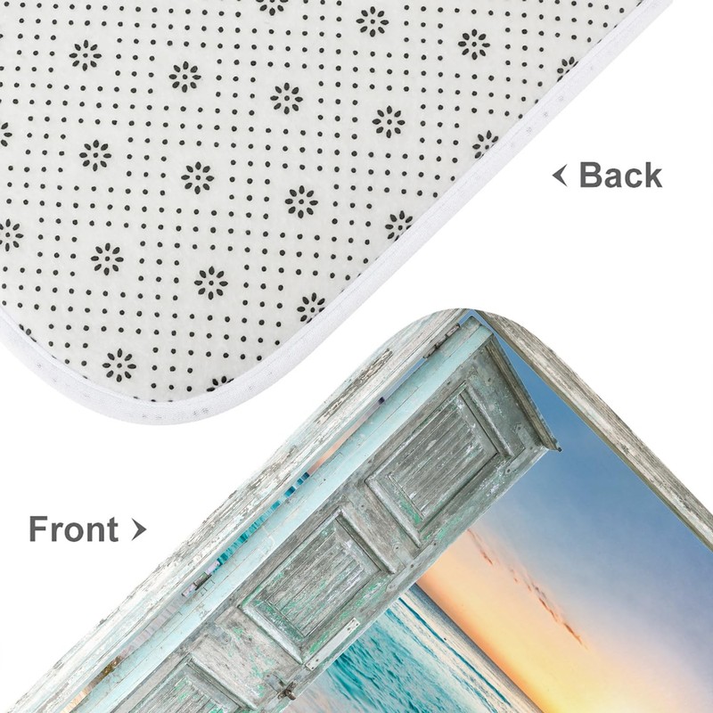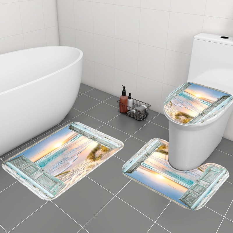 ZXMBF 4Pcs Beach Coastal Shower Curtain Sets Ocean Sunrise Seaside Seascape Sea Rustic Barn Door Teal Bathroom Decor with Non-Slip Rug,Toilet Lid Cover and Bath Mat with 12 Hooks