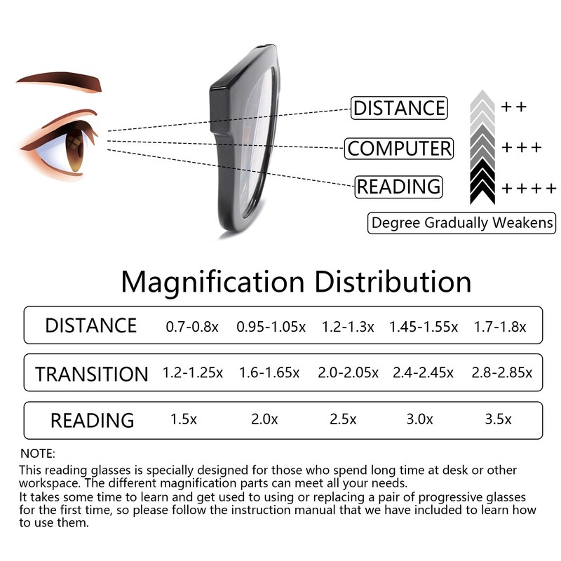 - 💎【3 LEVELS OF VISION】Designed for people who work long hours at desks or other workspaces, providing greater comfort and visual clarity. The top part is half-power magnification, which is used for daily communication, the middle part is slightly reduced power magnification, which is used for computer work, watching TV, etc., and the bottom part of the lens is full power magnification, which is used for close-range reading.