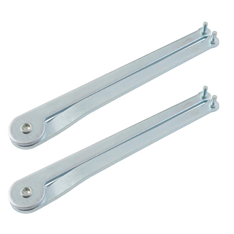 Adjustable locknut adjustable wrench for grinding machines. Pin spacing ranges from 7mm to 160mm and can be used with most angle grinders.