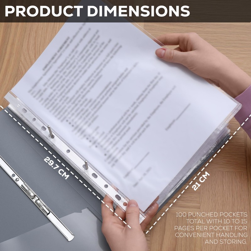 - ✔️ Contents: 100 punched pockets total with 10 to 15 pages per pocket for convenient handling and storing.
