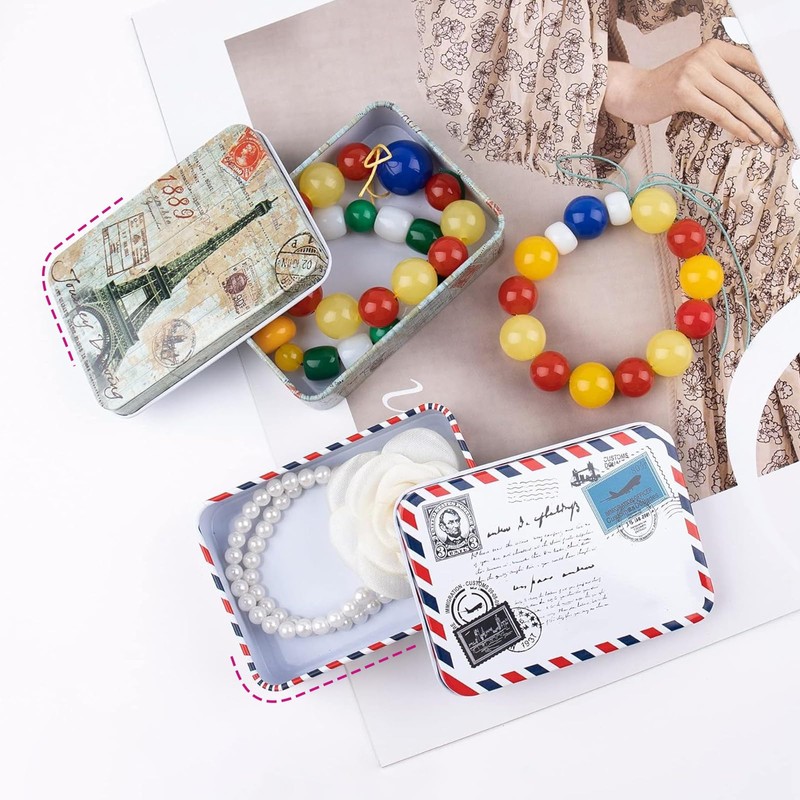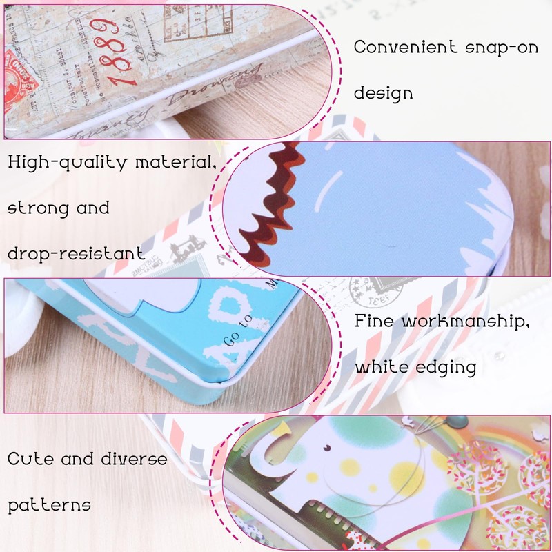 • CLASSIC DESIGN The metal tin small is modern and simple, yet vibrant, with a classic square, rounded shape and soft lines. Metal box small diverse pattern designs with cute retro adhesive tapes and other elements meet different aesthetic requirements. The versatile embellishments provide a varied look and make the storage box a practical and decorative object