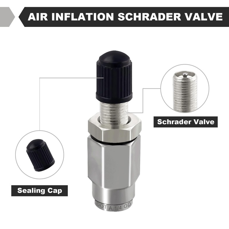 Our 1/4" Schrader Valves are approved by DOT, and they can work normally even if air pressure reaches up to 200PSI.