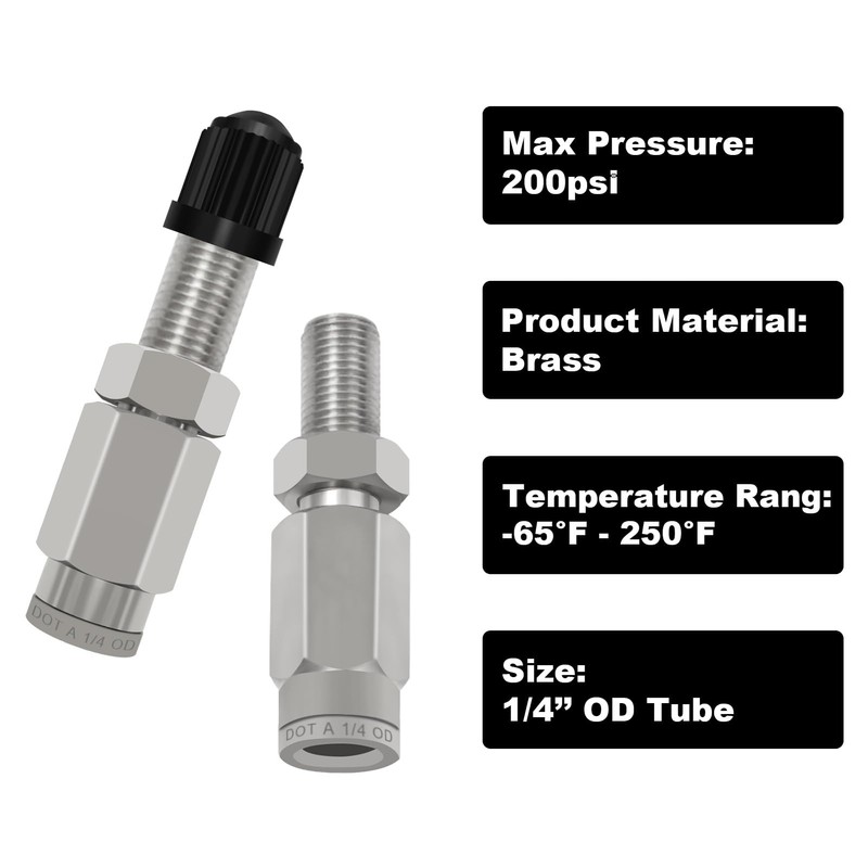 - Specification: Max working pressure: 200 psi, Temperature range: -40° F to +200° F (-40°C to +93°C), 1/4" OD air line tubing.