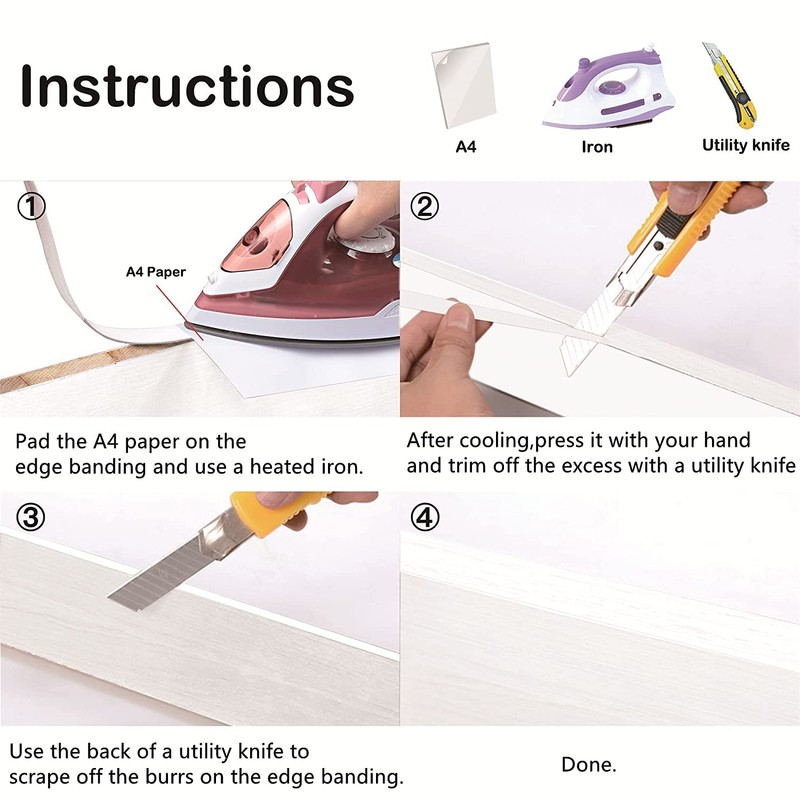 - ★[UPGRADE DESIGN]: The size of Edge Banding is 1 1/2 inch x 25ft, and the thickness is 0.6mm, It's suitable for your daily needs. Edge Banding is a strip of wood veneer with heat melt adhesive pre-applied to the back. You simply hold the edge banding in place, then run over it with a heated iron and A4 Paper. After cooling, please press it with your hand and trim off the excess sides with the Utility Knife, 0.6mm thickness can let you easy to do.