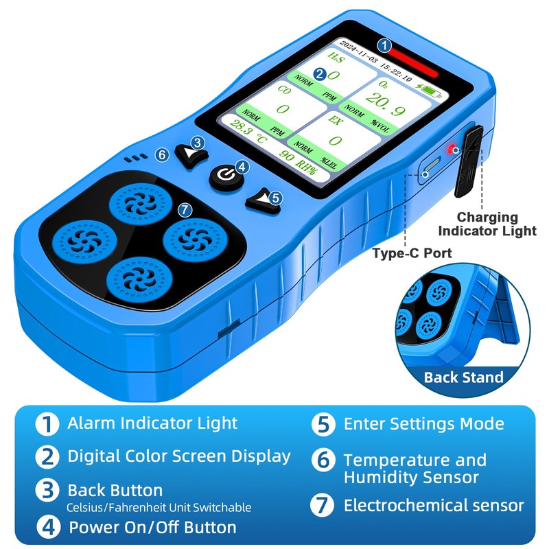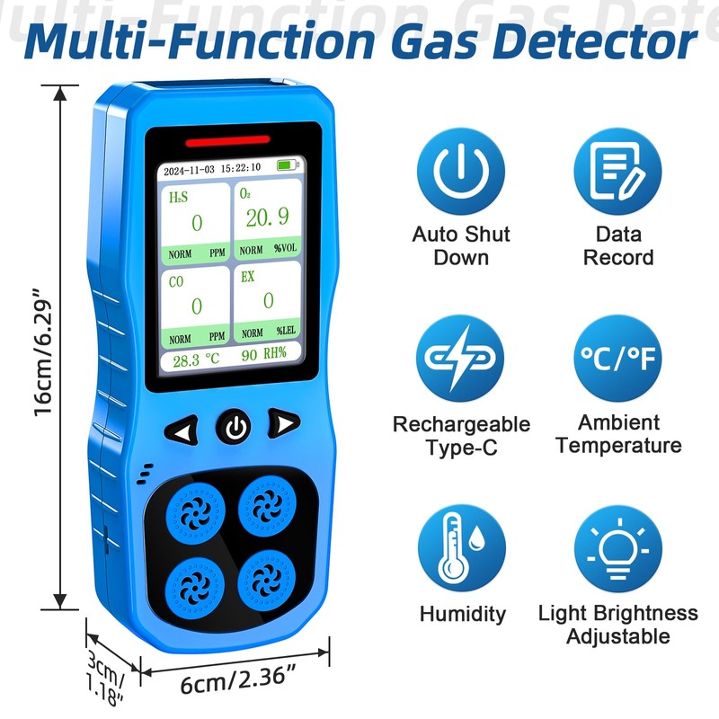 - Humanized Design: Simply turn on to detect gas and easily restore the gas monitor detector to factory settings. Real-time gas concentration of H2S, O2, CO, LEL levels are shown on the 2.8" color LCD screen, as well as ambient temperature(℉/℃) and humidity.