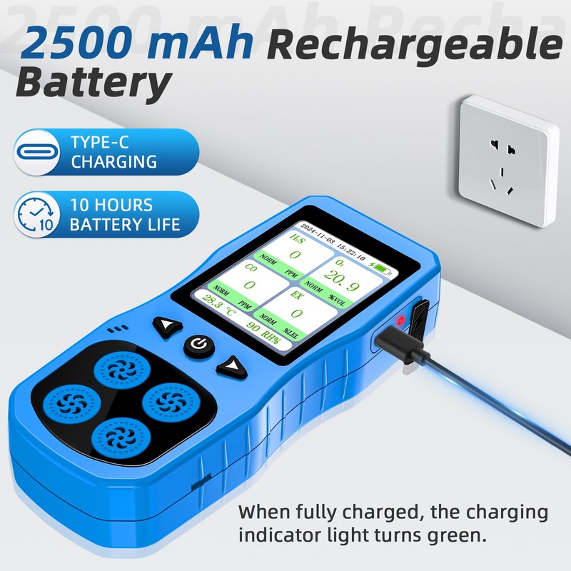 - Rechargeable Gas Tester: Built-in 2500 mAh rechargeable battery, which enables it to work for some 10 hours in stand-by mode. Auto / Manual power off optional to save your battery. It comes with a carry case, charging cable and alligator clip on the back of the detector, easy to carry