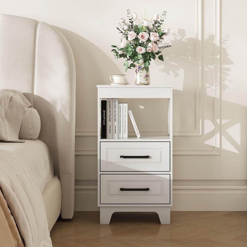 • Large-capacity 2 layer drawer bedside table: This bedside table is equipped with 2 drawers and open space, providing enough storage space. It can easily store small bedroom items such as books, remote controls, glasses, skin care products, etc., keeping the bedside neat and tidy.