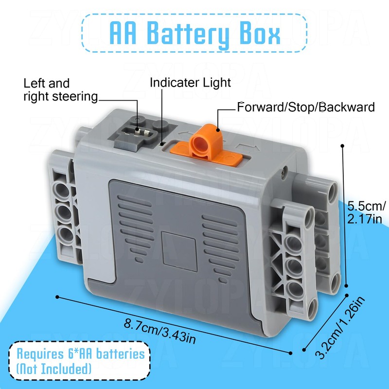 - AA Battery Box is used to provide power to the model to enable it to move, light up or make sounds. Requires 6 AA (1,5V) batteries, not included.