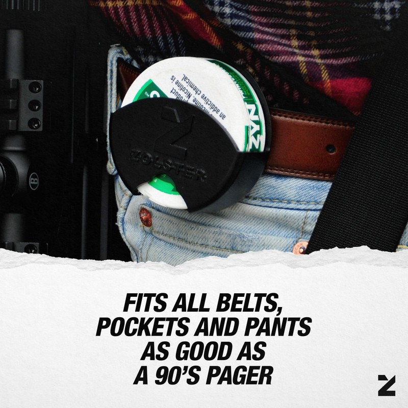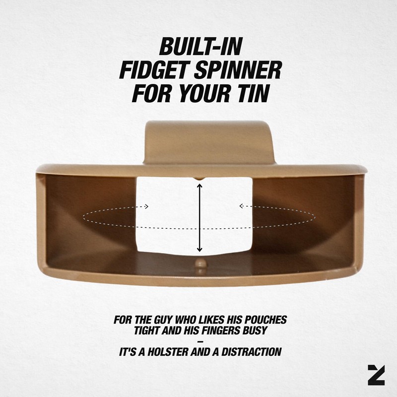 - Hands-Free Access: Keep your Zyn tin secure and easy to grab—no more pocket searches on the go. Built-In Fidget Spinner: Smooth spin action to keep hands busy and stress at bay all day. Heavy-Duty Clip: Attaches firmly to your belt, waistband, or pack, tough enough for any adventure. Lightweight Durability: Made from premium, rugged materials, Zolster is built to last without weighing you down