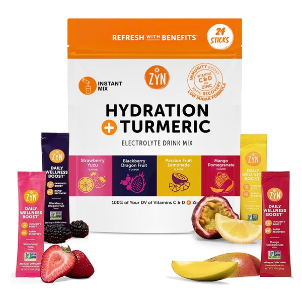 ZYN ZYN Electrolyte Drink Mix Hydration Packets, Electrolytes Powder, Hydration Packets w/Turmeric Curcumin, Vitamin C and D, Zinc, Hydrate Electrolyte Powder Packets for Wellness, Variety Pack of 24
