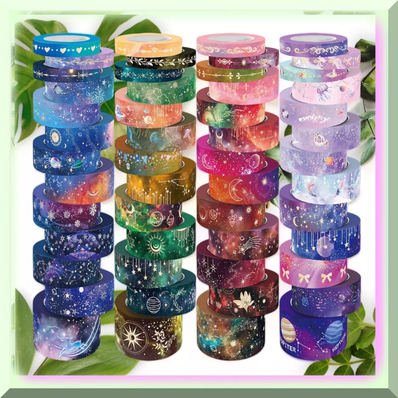 Elevate your crafting game with our stellar washi tape set! Unleash your creativity with 52 rolls of star-studded decorative tape, available in 4 different sizes. Each tape is adorned with exquisite gold and silver stamping, adding a touch of elegance to your projects. Get ready to shine bright like a crafting star!---FEATURES:---Astonishing Assortment of Artistic Adhesives! Our remarkable washi tape collection offers an array of options to satisfy your creative cravings. With a whopping 52 rolls, each adorned with unique patterns, you'll be spoilt for choice. Furthermore, we cater to all your crafting needs with four different sizes of washi tapes. Whether you desire petite precision or bold brilliance, our versatile selection has got you covered. Unleash your imagination and embark on a tapestry of artistic possibilities with our diverse range of sizes and patterns.
