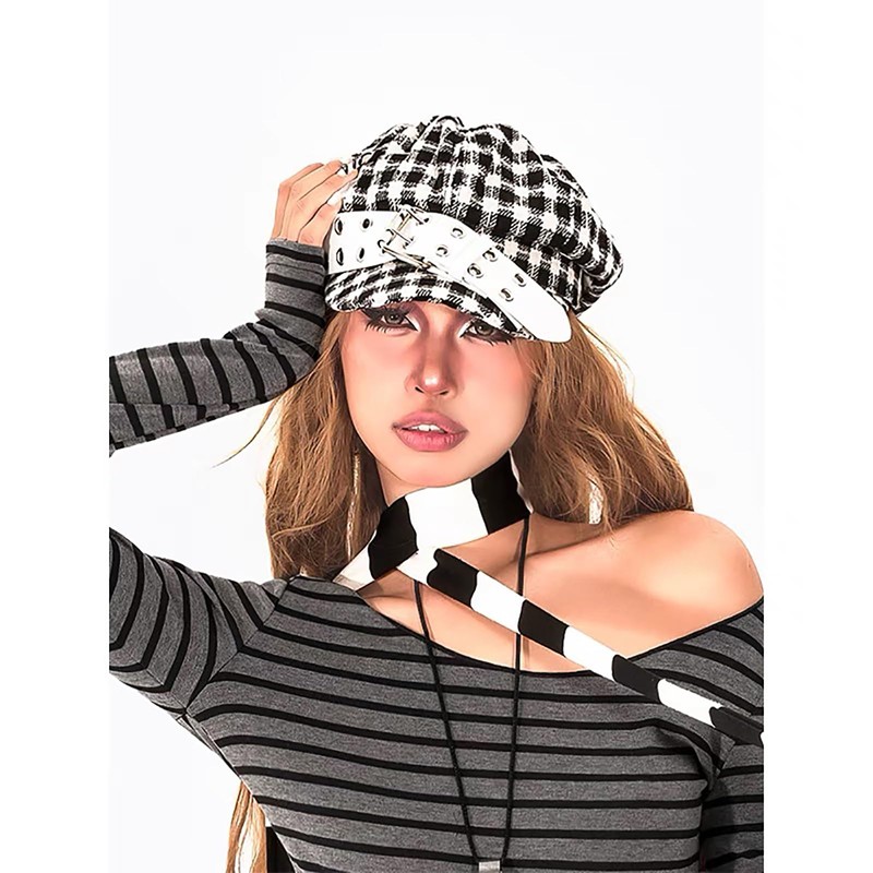 ZYOOFOV Mine Type Newsboy Hat Cap Belt Buckle Women's Unisex Plaid with Brim Cute Gothic Style Subculture Cal Harajuku Style Punk UV Protection Sunscreen Small Face Effect, white