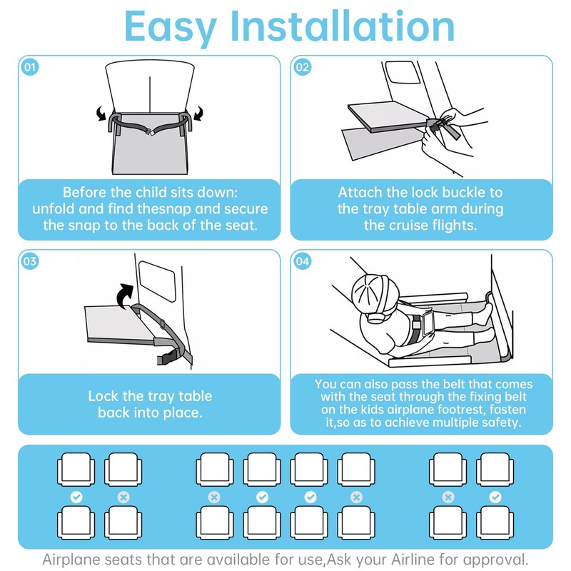 - 【Please Consult the Airline in Advance】 Please confirm the seat size and whether your airline allows installation of toddler airplane seat hammock before traveling. Airplane bedcan be used in window seats or middle row seats with seat trays, but not in aisle seats or exit row seats. Please install toddler airplane travel bed after the aircraft reaches cruising altitude.