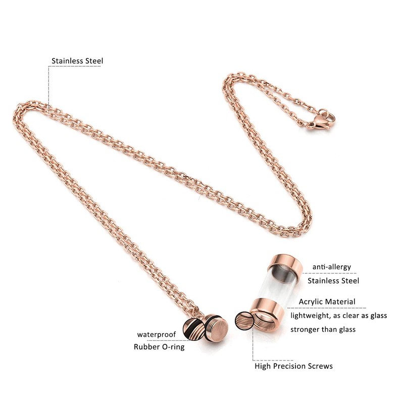 - Necklace Specificadtion ● 1 Piece Rose Gold. Tube Size: 9*31mm. Bottle Neck Diameter: 6mm, Deepth: 15mm. Chain Length: 610mm/24 Inch Packaged In A Elegant Balck Gift Box.