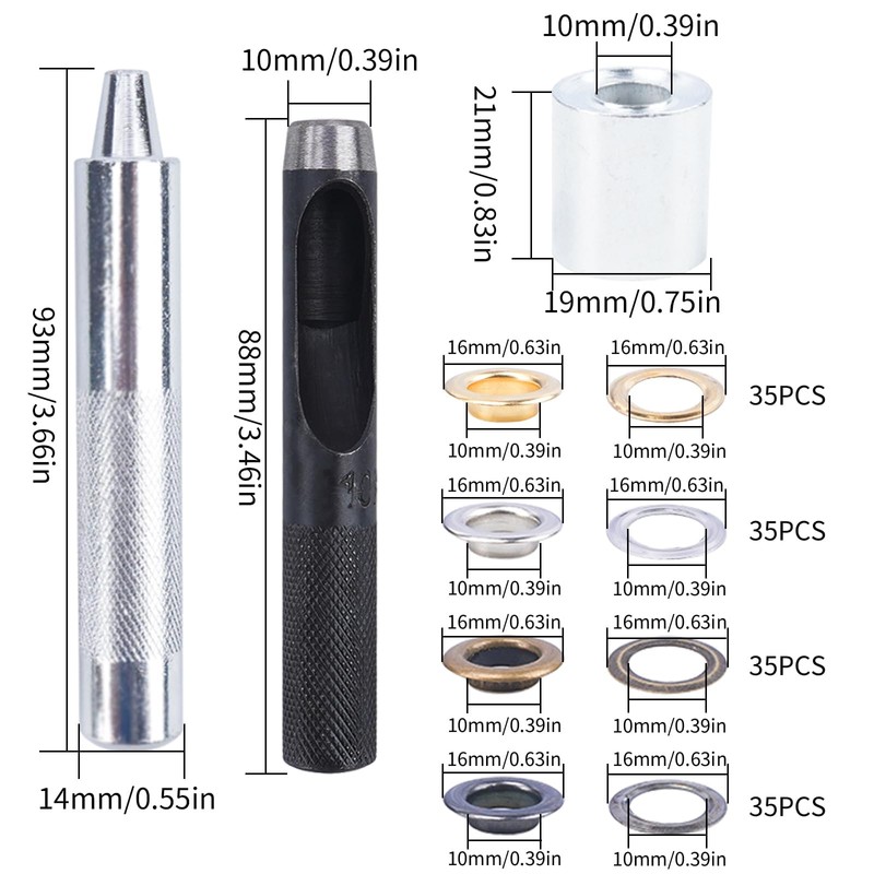 - Easy to Install: Eyelet set is easy to use. Just use the punch tool to punch a hole in the material, then put the eyelet in, and then fix the eyelet set with the included tool.